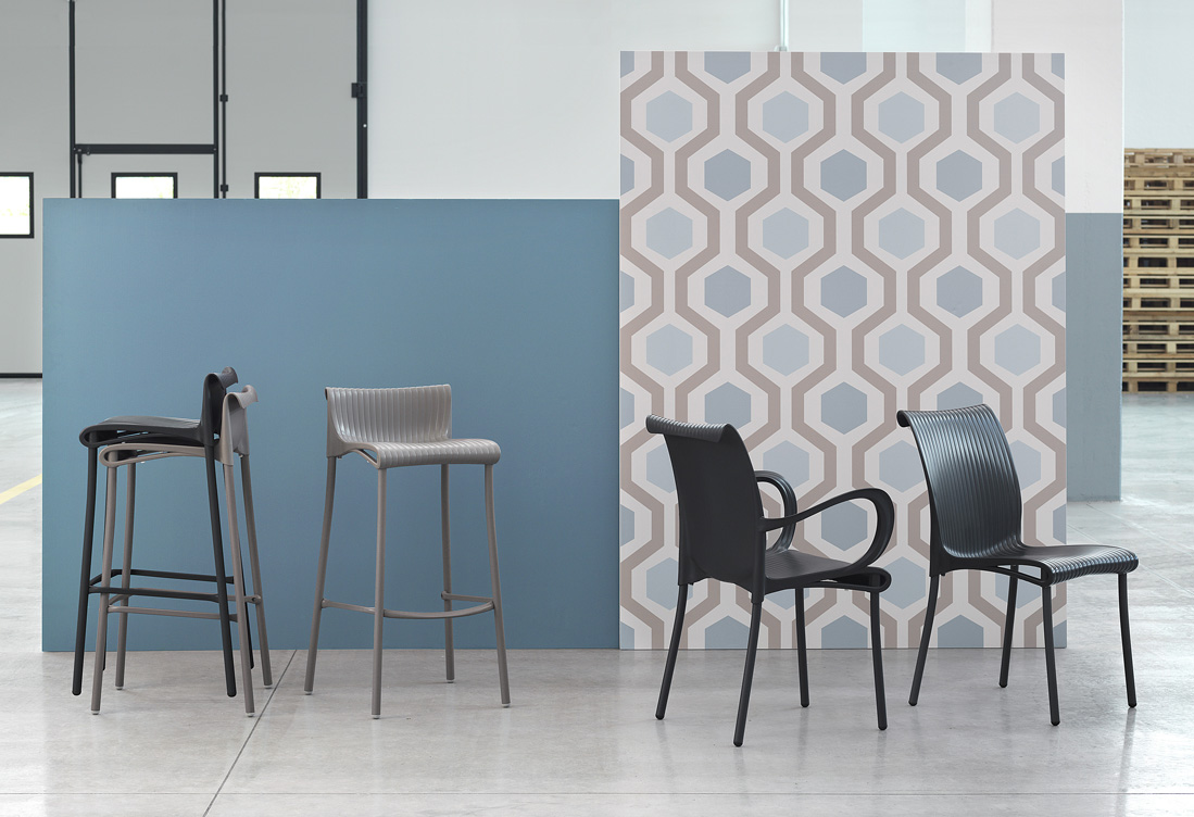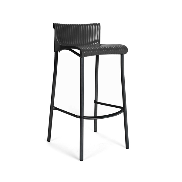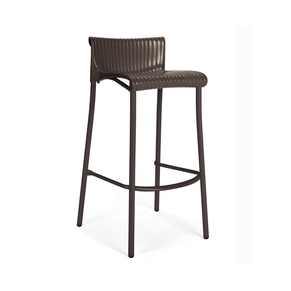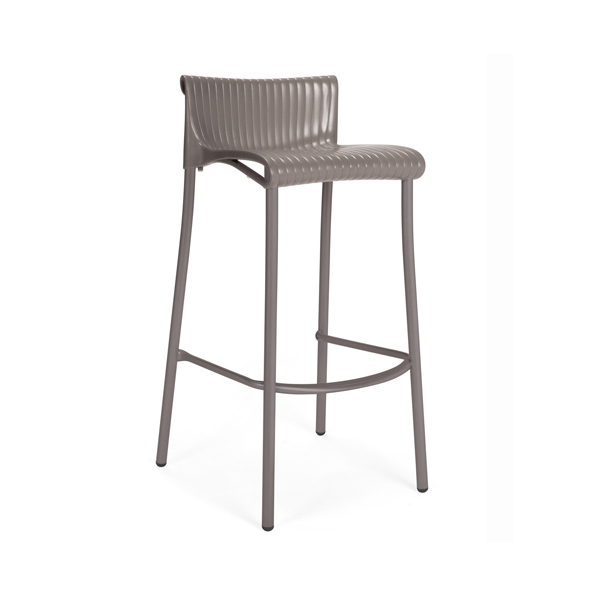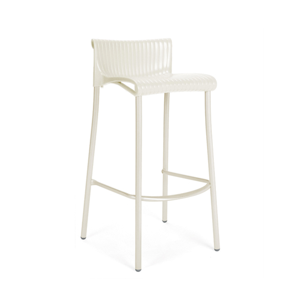 Stackable outdoor stool with seat made of uniformly colored fiberglass polypropylene resins with uv additives.. Structure in coated aluminum. With non-slip feet.