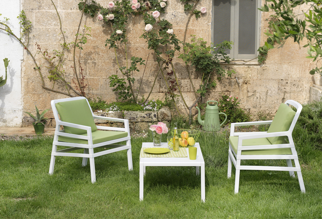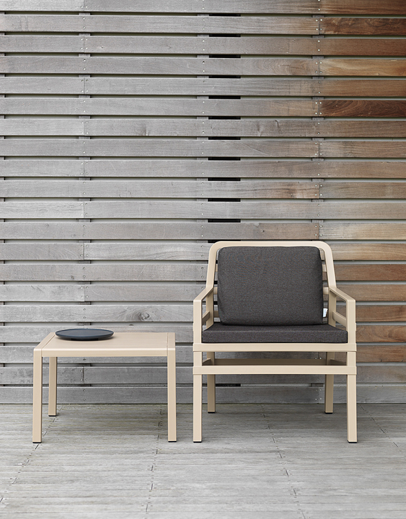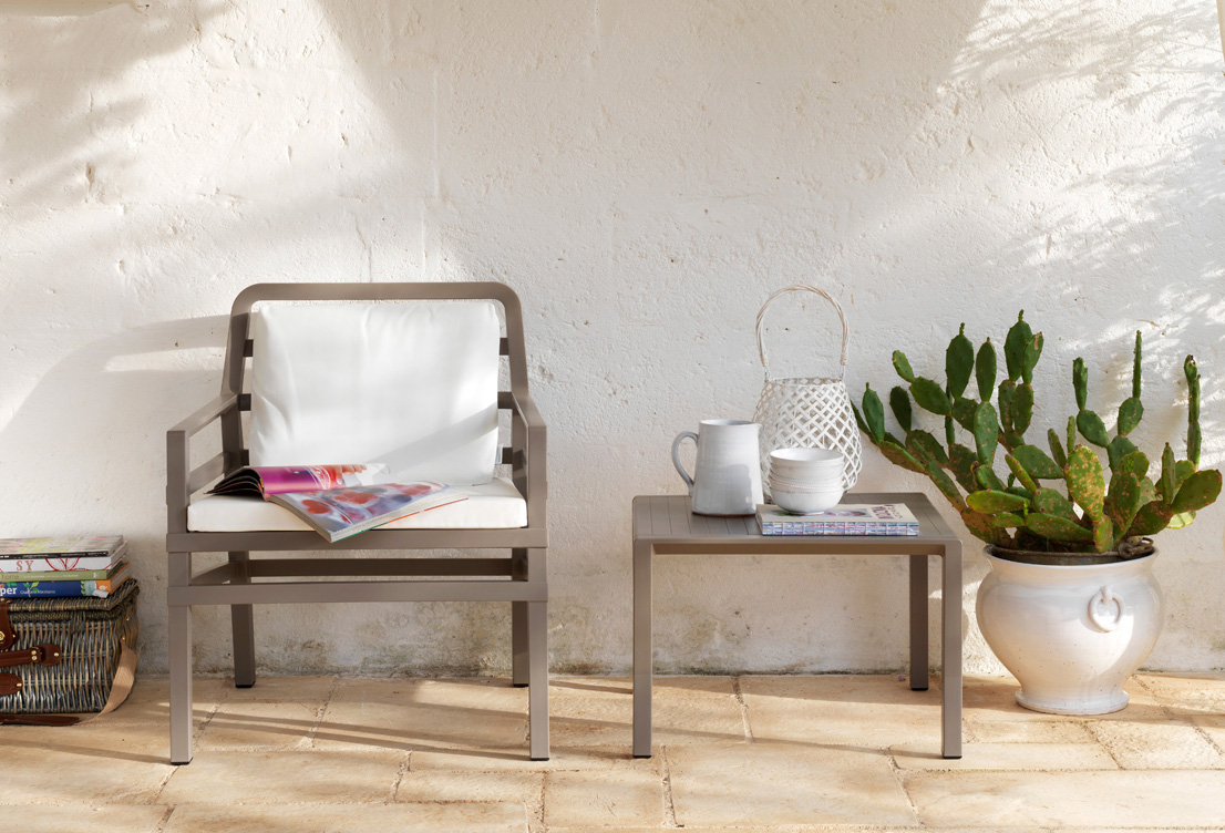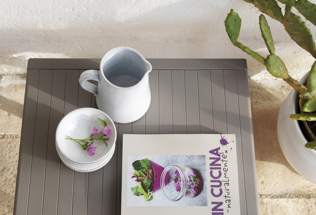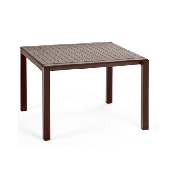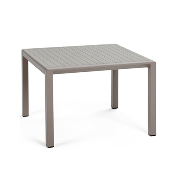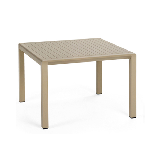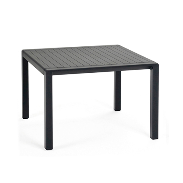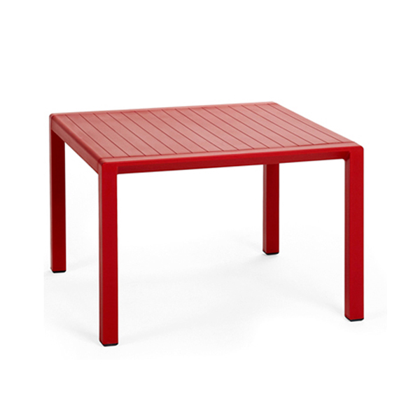 60×60 cm low table in polypropylene treated anti-UV and colored in bulk, removable. Equipped with non-slip feet.