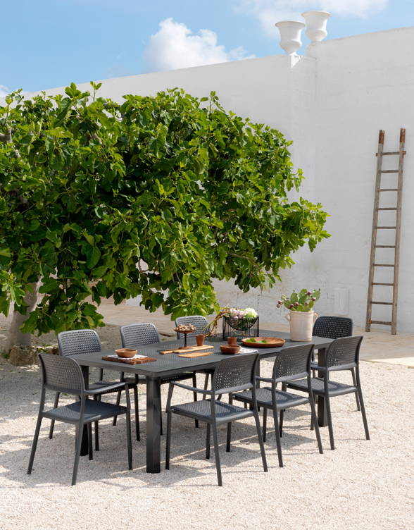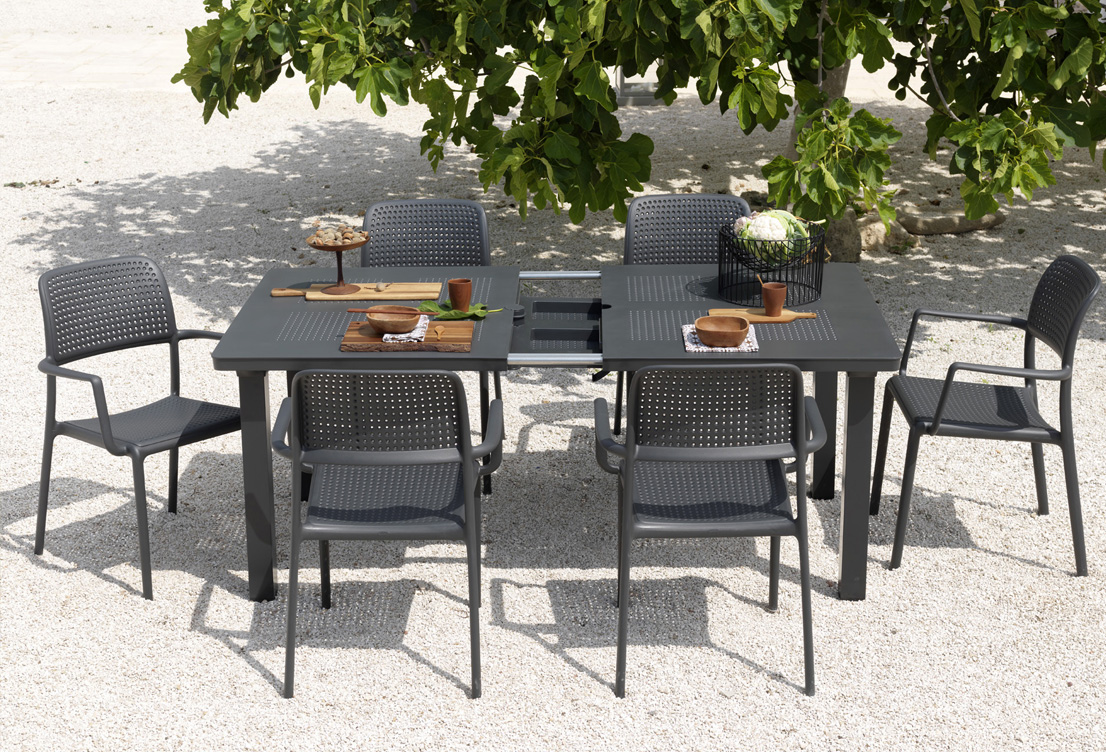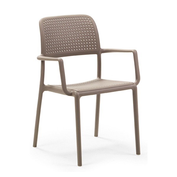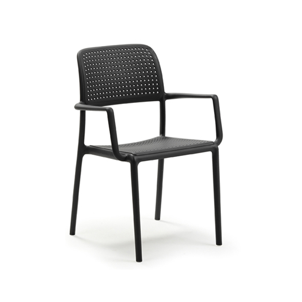 Stackable chair with armrests, in fiberglass polypropylene treated anti-UV and colored in mass. Equipped with non-slip feet. Matt finish