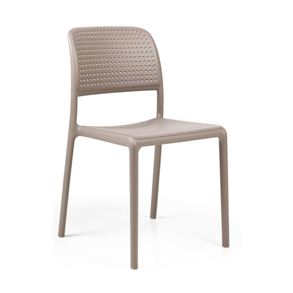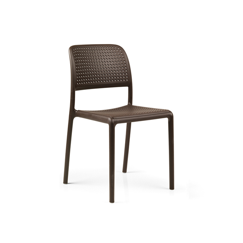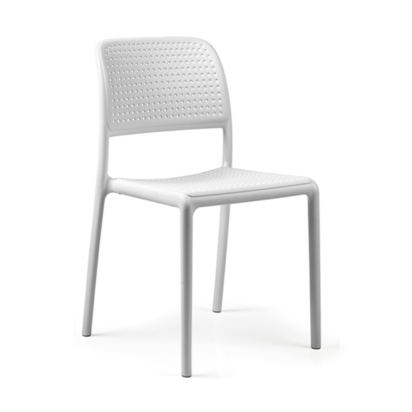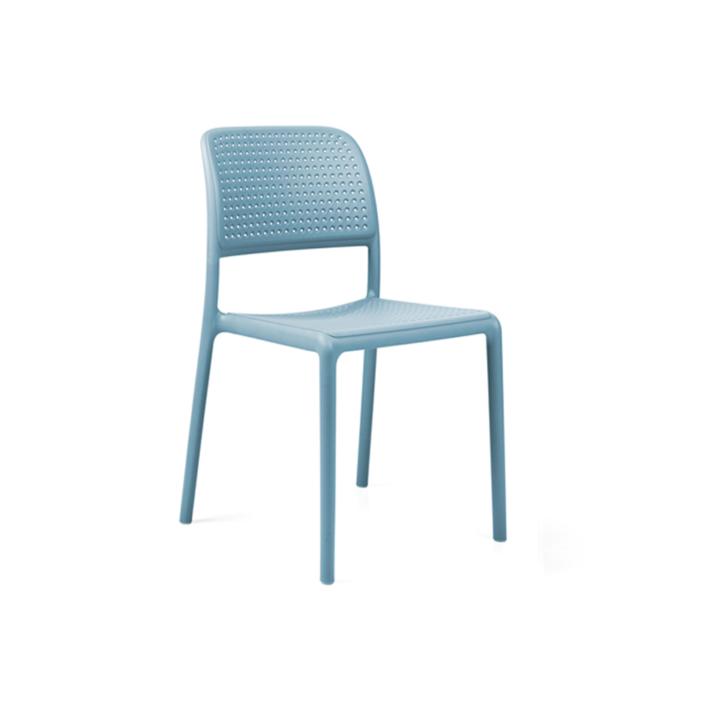 Stackable chair without arms, in fiberglass polypropylene treated anti-UV and colored in mass. Equipped with non-slip feet. Matt finish