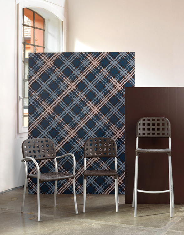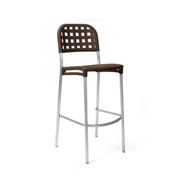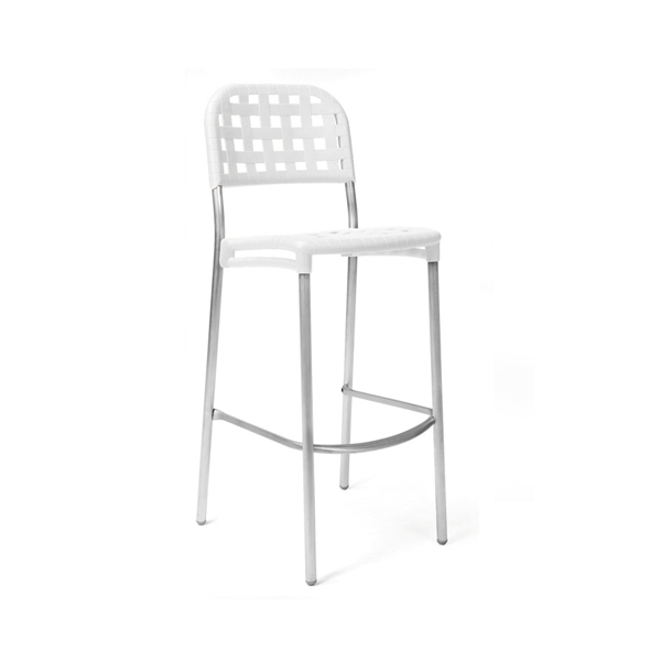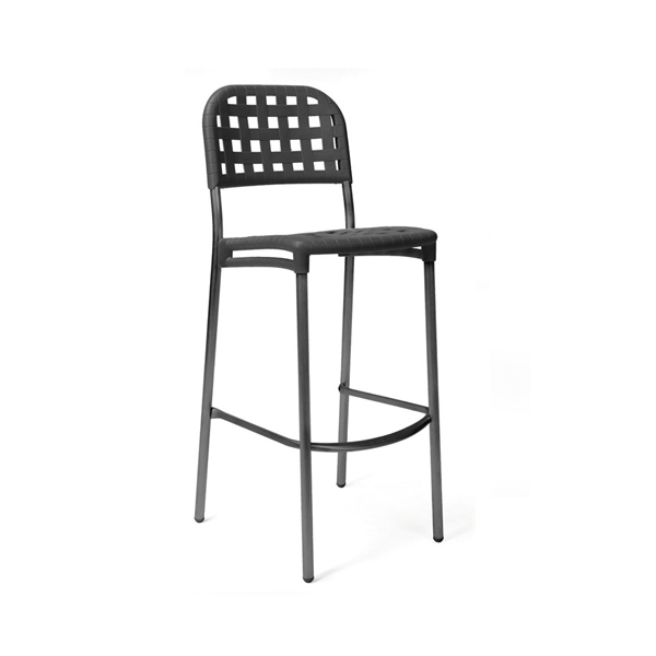 Stackable outdoor stool with seat made of polypropylene resins with UV additives and is uniformly colored. Structure in coated aluminum.