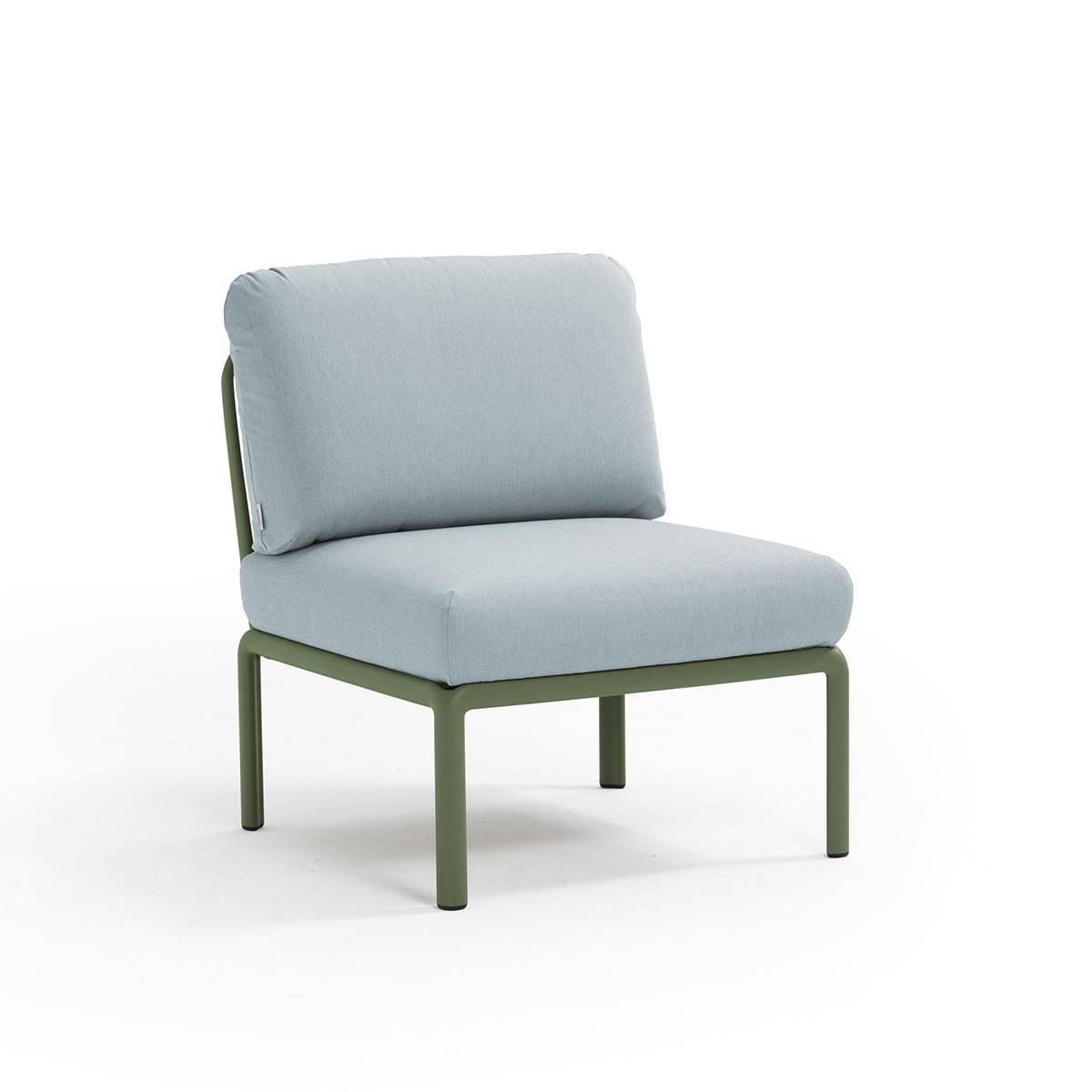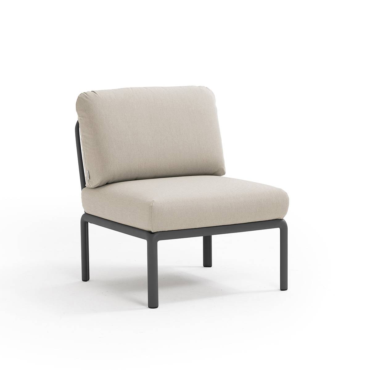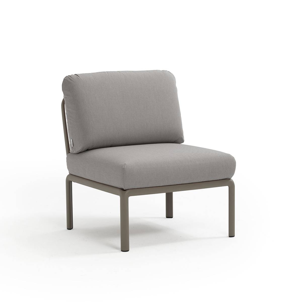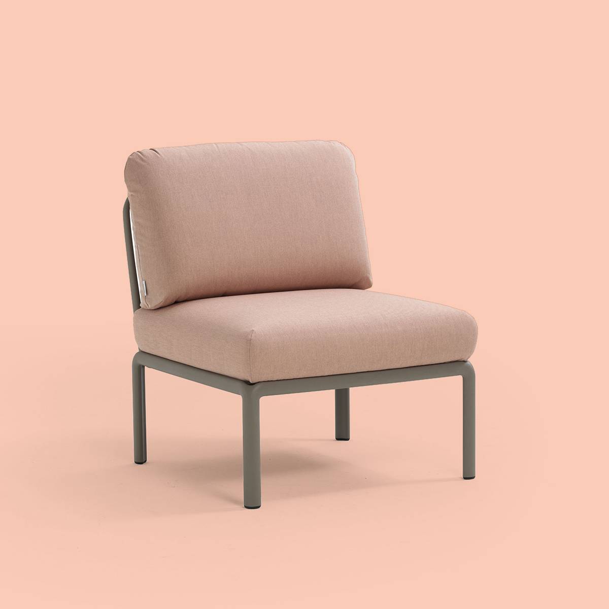 Armchair without armrests in fiberglass resin and upholstered. Available individually or designed as a central element in larger compositions from the Komodo modular seating collection.