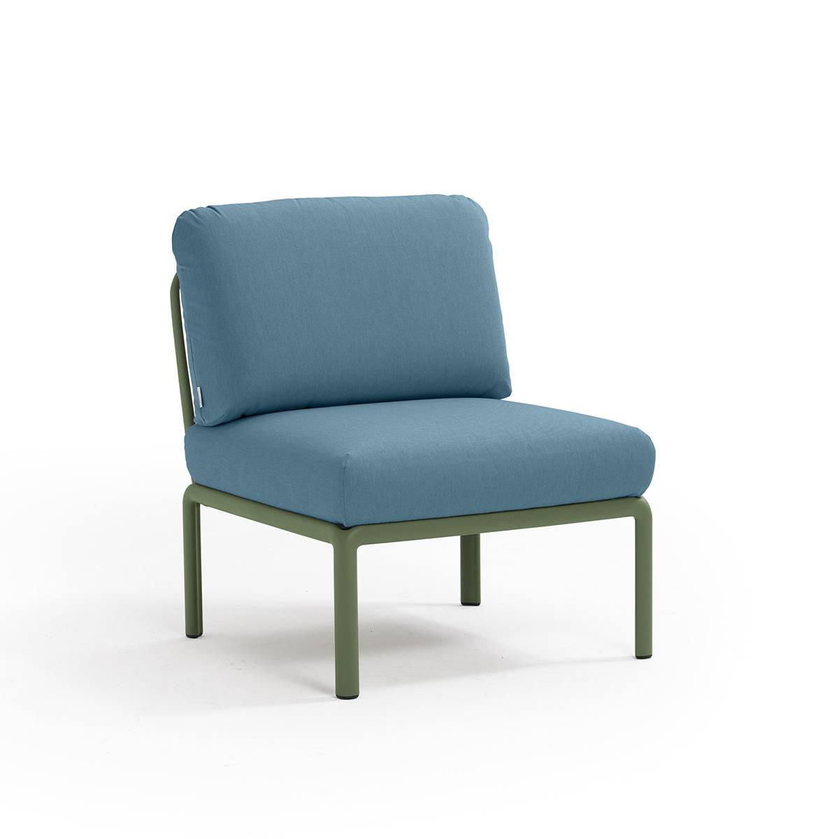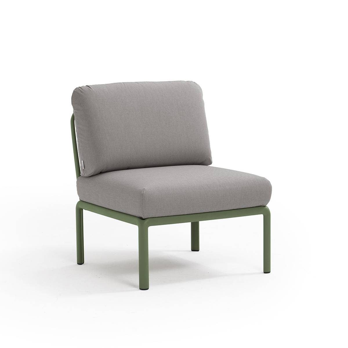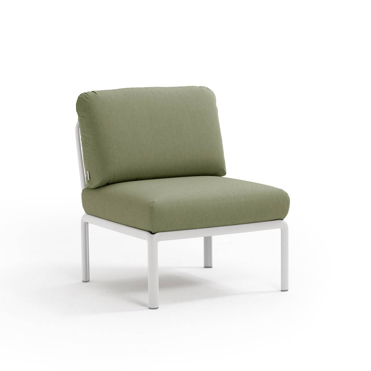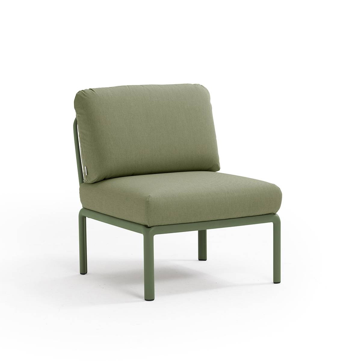 Armchair without armrests in fiberglass resin and upholstered. Available individually or designed as a central element in larger compositions from the Komodo modular seating collection.