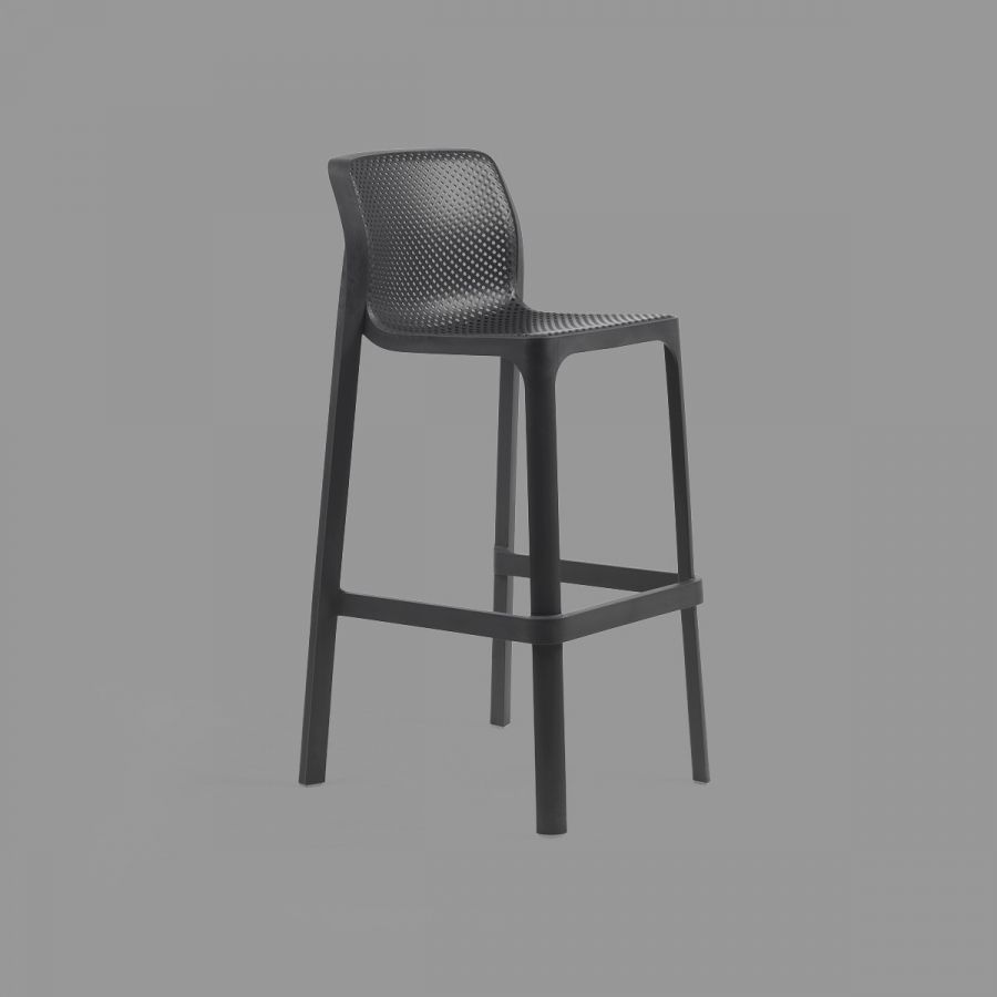 Monobloc stool. Polypropylene fiberglass treated anti-UV and mass colored. Matt finish. Equipped with non-slip feet. Seat height 76 cm. Recyclable resin.