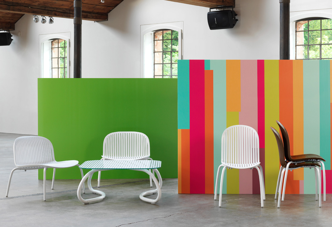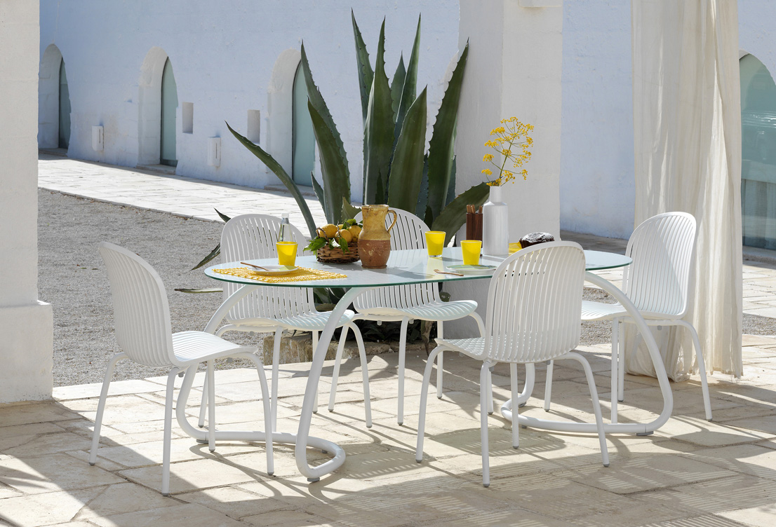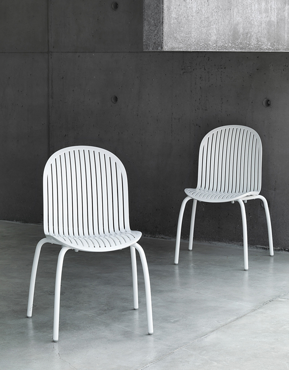Stackable chair, polypropylene shell treated anti-UV and colored in mass. The legs are in anodized or painted aluminum. Equipped with non-slip feet.
