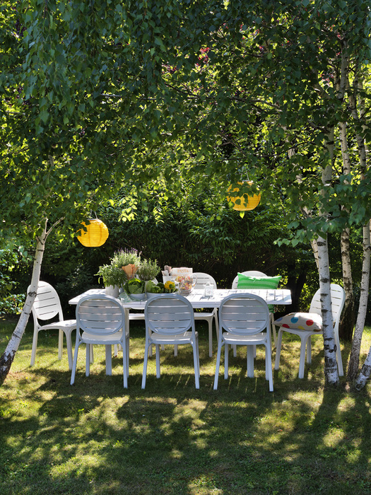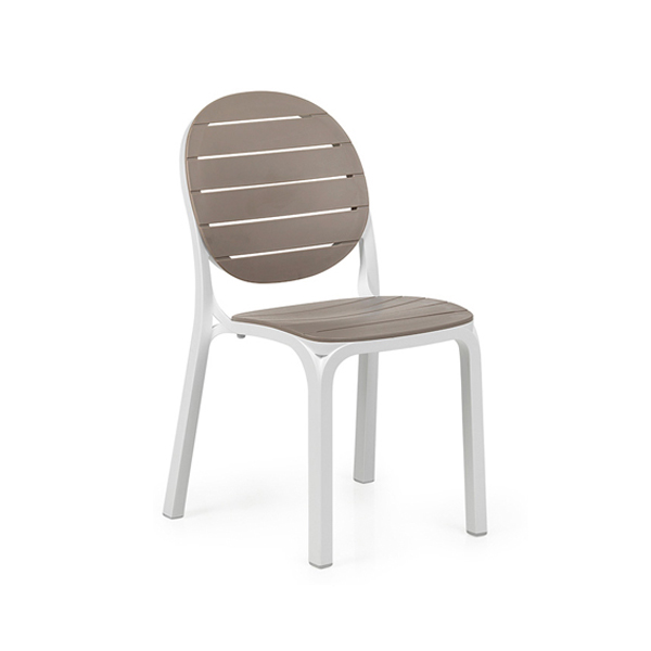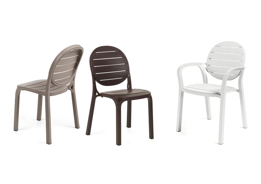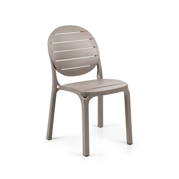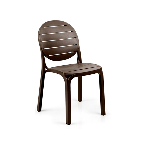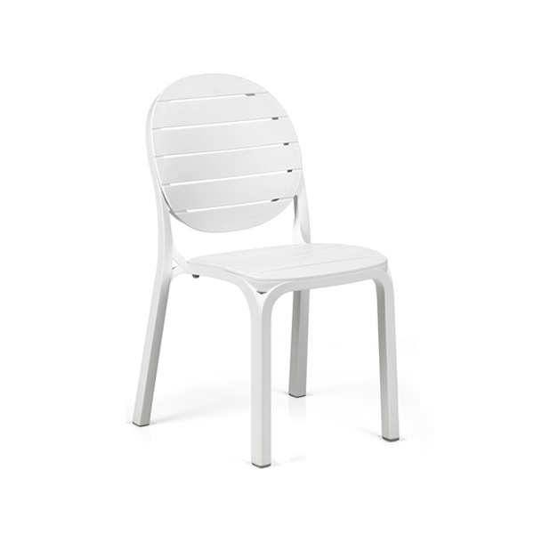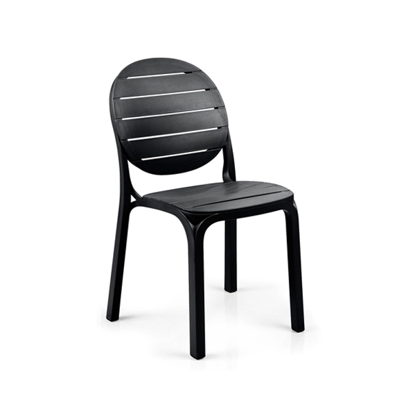 Stackable chair without arms in polypropylene treated anti-UV and colored in mass. Equipped with non-slip feet.
