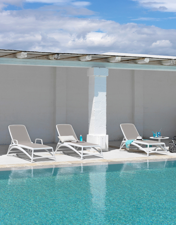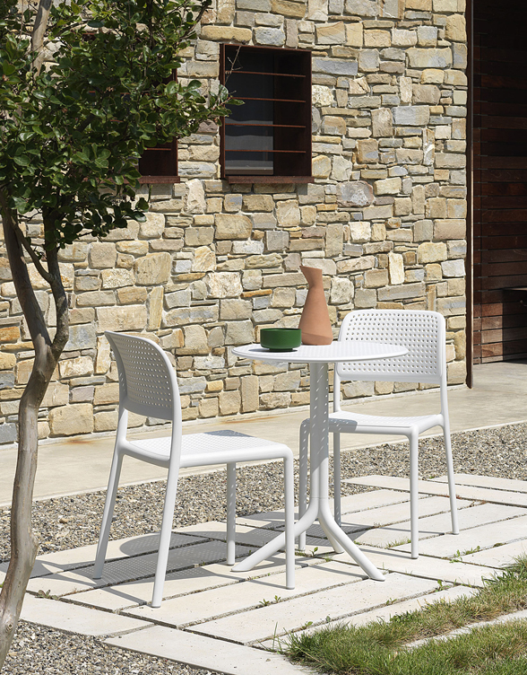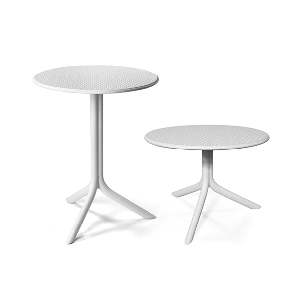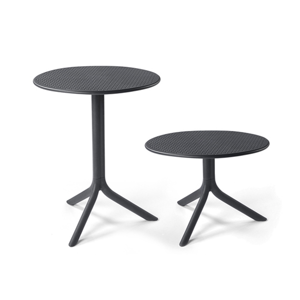 Table with central leg with 3 spokes and double height (standard H 73 cm and mini H 40 cm), in fiberglass polypropylene treated anti-UV and colored in mass. Equipped with non-slip feet. Matt finish