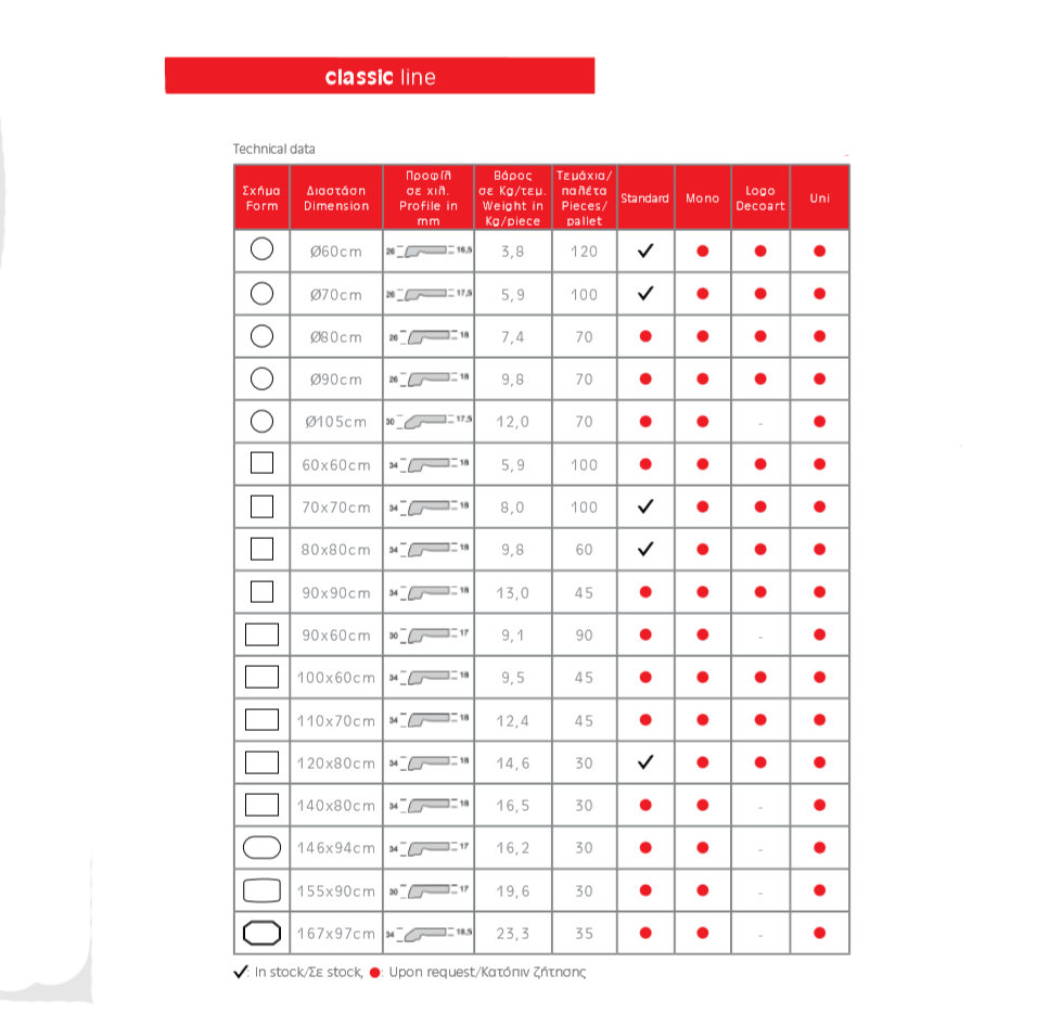 / Διαθέσιμες διαστάσεις επιφάνειας τραπεζιών Topalit Classic Line & Smart Line